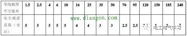 口訣(二)導線(xiàn)截面安全電流系數表: