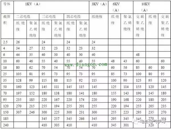 說(shuō)明:十下五是指導線(xiàn)截面在10平方毫米以下,每平方毫米的安全電流為5安培;百上二是指導線(xiàn)截面在100平方毫米以上,每一平方毫米安全電流為2安培;二五三五四三界是指導線(xiàn)截面在16平方毫米、25平方毫米,每1平方毫米安全電流為4安培,導線(xiàn)截面在35平方毫米和50平方毫米,每1平方毫米安全電流為3安培;七零、九五兩倍半是指每1平方毫米的安全電流為2.5安培;裸線(xiàn)加一半,銅線(xiàn)升級算是指截面的裸導線(xiàn),可按絕緣導線(xiàn)乘以1.5倍計算安全電流,同截面的銅導線(xiàn)按鋁導線(xiàn)大一線(xiàn)號等級計算安全電流;穿管溫度八、九折是指導線(xiàn)穿管乘系數0.8,高溫場(chǎng)所實(shí)用乘以系數0.9。www.diangon.com
